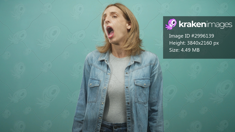 Woman smiling with mouth open showing teeth in a teal studio, wearing denim jacket and grey tee, standing center facing camera; joyful ease.