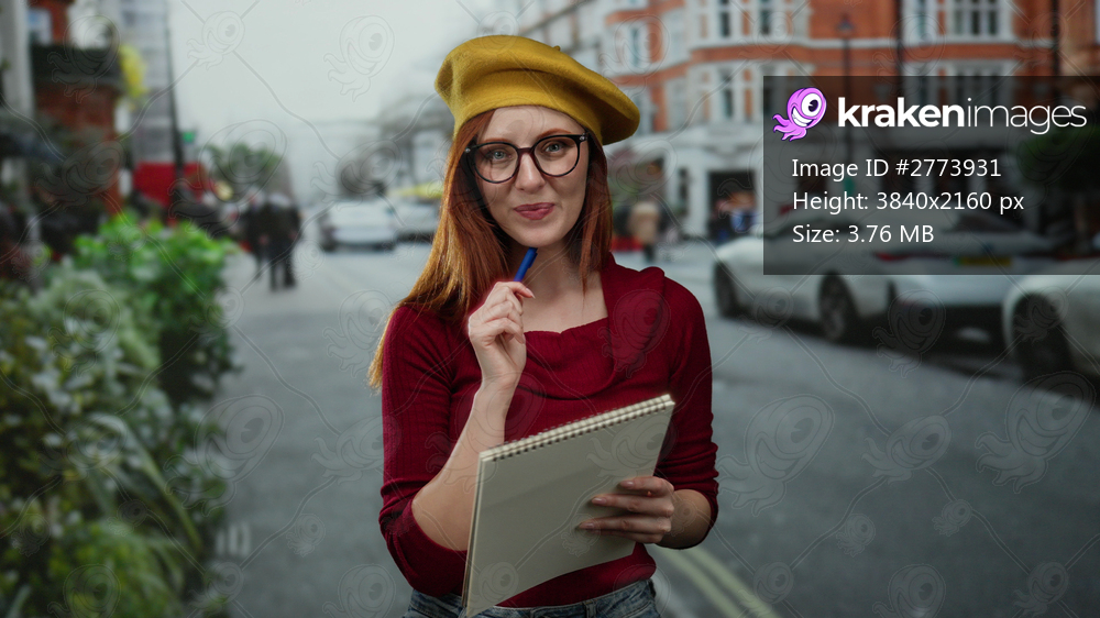 Woman smiling with notepad on street in urban city setting, redhead sketching outdoors, vibrant scene showing artistic inspiration.