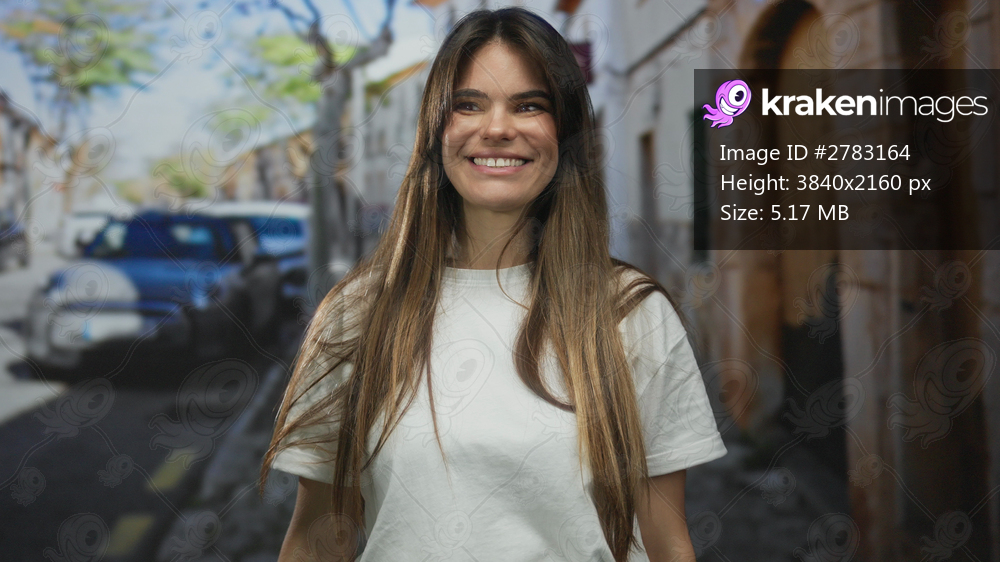 Woman smiling on a bustling city street with vintage cars under a clear blue sky, capturing the lively urban atmosphere with a sense of carefree joy.