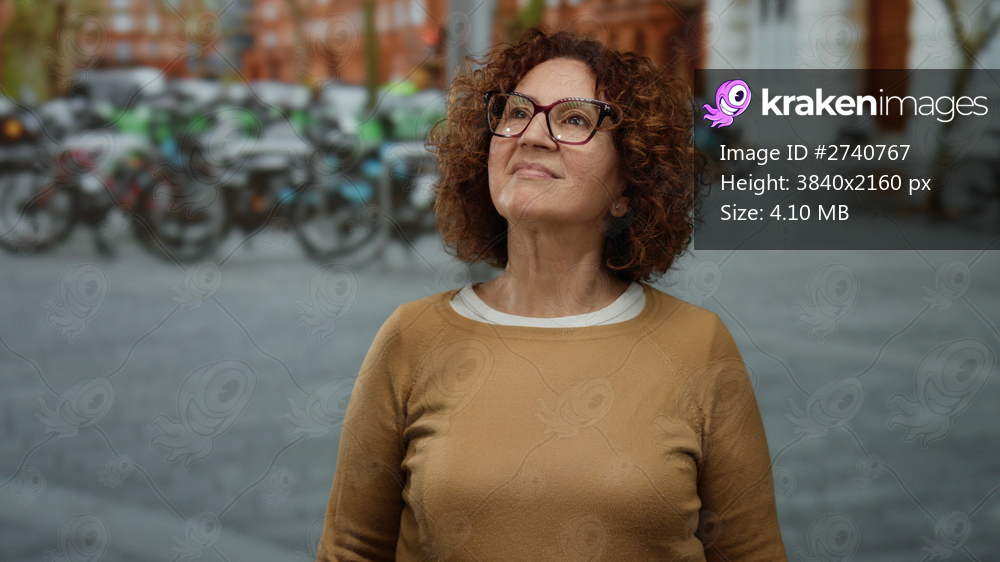 Woman smiling on a busy city street with bicycles in the background, showcasing a casual urban scene with smiling expression and vibrant outdoor atmosphere. - Kraken Images