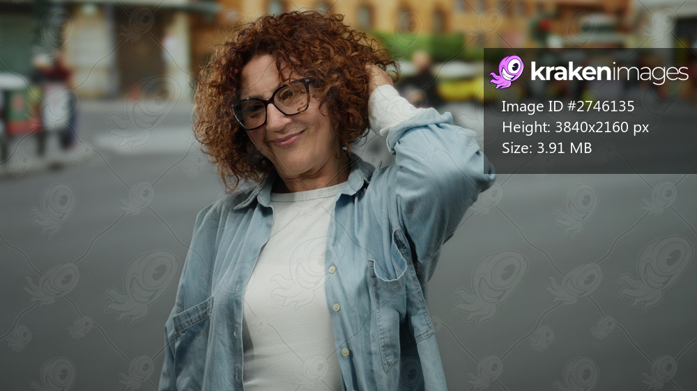 Woman smiling on a busy city street with blurred background, wearing glasses and casual attire, exuding joyful confidence in an urban outdoor setting.