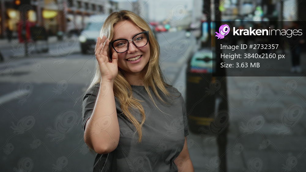 Woman smiling on a city street with blonde hair and glasses, enjoying an outdoor urban scene amid a vibrant backdrop.