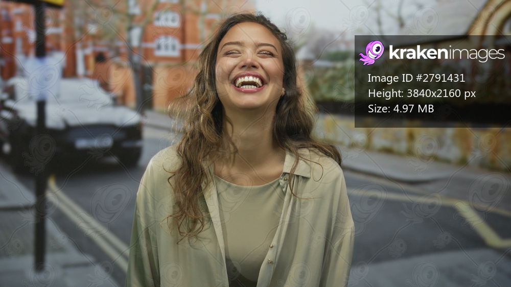 Woman smiling on a city street, exuding happiness and confidence with vibrant urban surroundings, showcasing casual fashion in a lively outdoor setting. - Kraken Images
