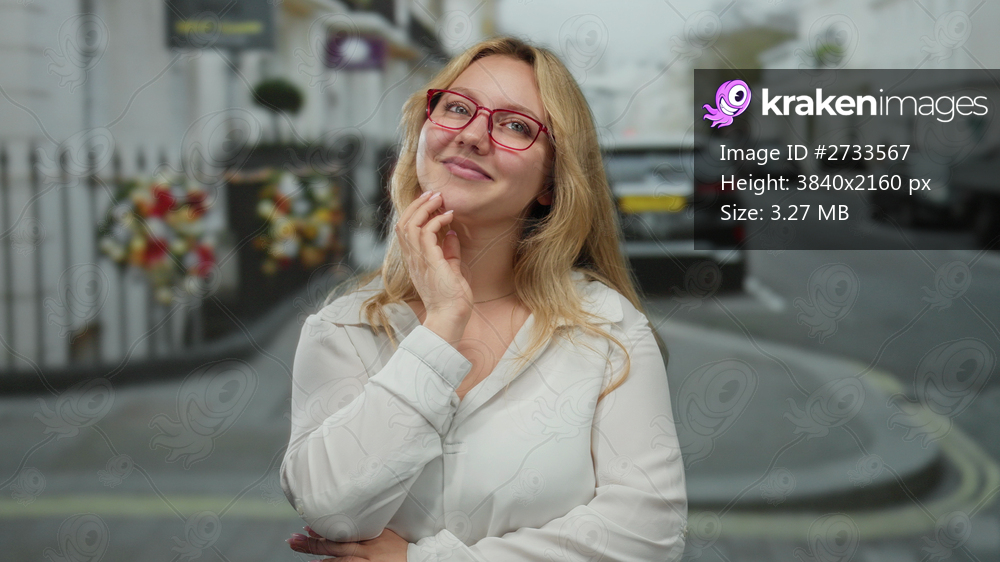 Woman smiling on a city street with flowers and cars in the background, wearing glasses and a white shirt, exuding confidence outdoors.