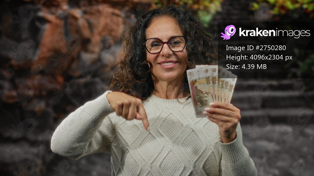 Woman smiling on a city street holding russian banknotes pointing down outdoors indicating currency concept context