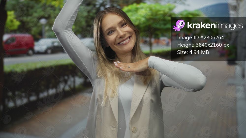 Woman smiling on a city street makes a framing gesture with hands in an outdoor setting with trees and cars in the background.