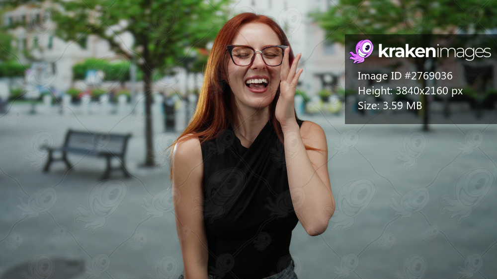 Woman smiling on a city street with trees, showcasing red hair and glasses, embodying beauty and elegance in an urban environment.