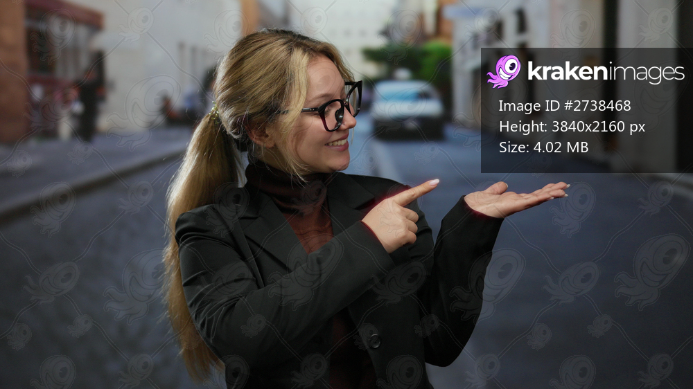 Woman smiling on a city street while pointing to her open palm, wearing glasses and a blazer, showcasing a positive and professional demeanor in an urban setting. - Kraken Images