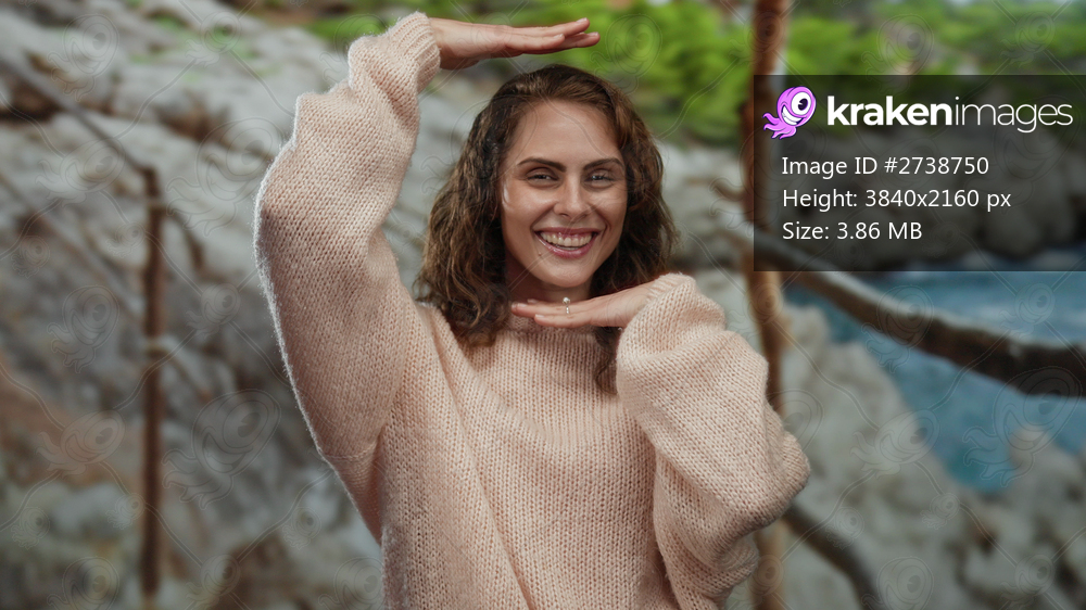 Woman smiling on a rocky seaside, wearing a cozy sweater, making a joyful framing gesture with her hands, capturing the essence of a carefree outdoor beach moment. - Kraken Images
