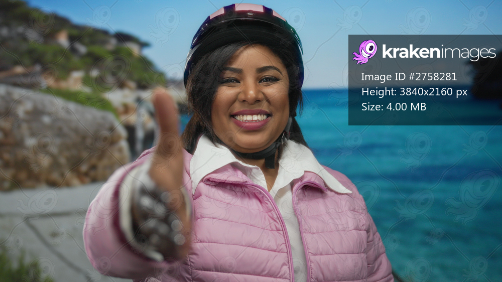 Woman smiling on a seaside path in a pink jacket and helmet reaching out to the camera with a beach and blue sea in the background.