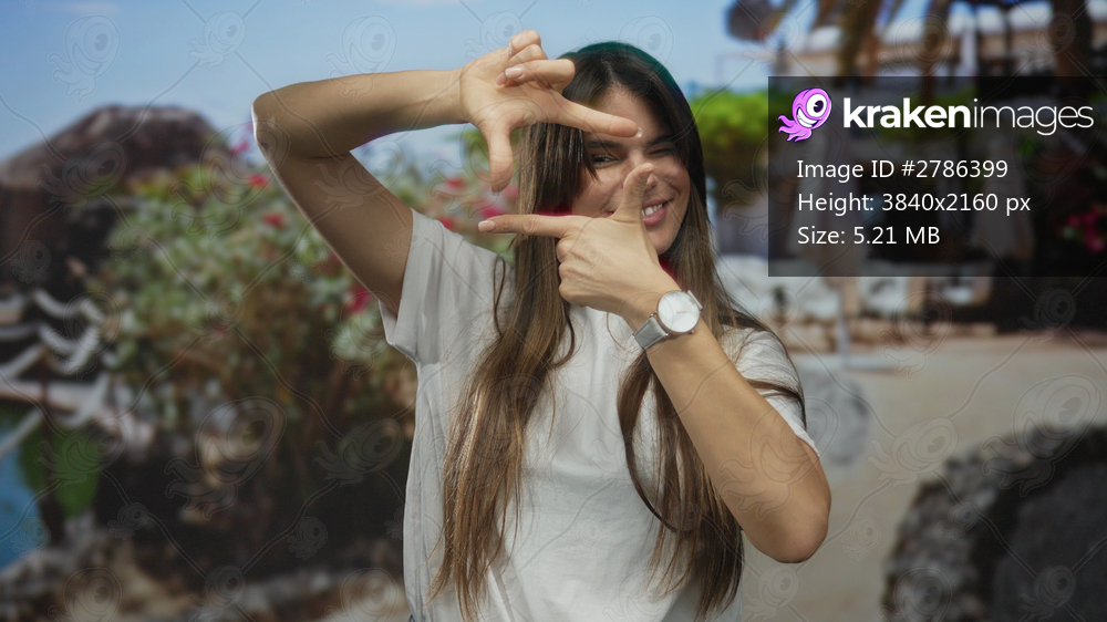 Woman smiling on a sunny beach making a frame gesture with her hands surrounded by vibrant flowers and clear blue sky