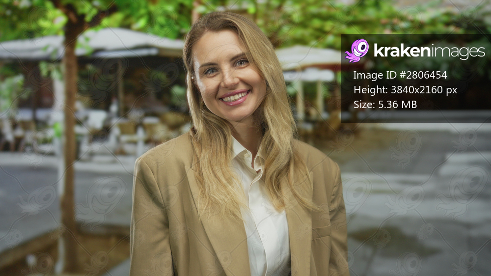 Woman smiling on a sunny terrace in a city setting with blonde hair, wearing a beige coat, suggesting a pleasant outdoor cafe experience in urban life. - Kraken Images