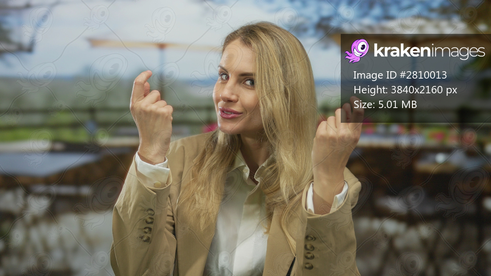 Woman smiling on a terrace at a restaurant with blonde hair wearing a beige jacket in a cityscape setting with blurred background showing an outdoor coffee shop ambiance. - Kraken Images