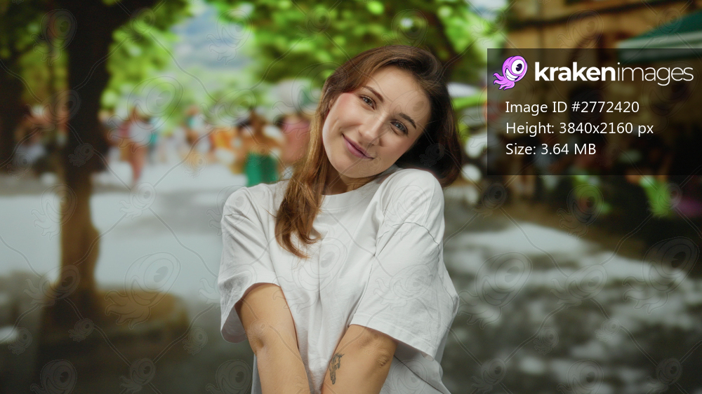 Woman smiling on a vibrant city street surrounded by trees and colorful crowds enjoying a bright day showcasing urban outdoor life and youthfulness.