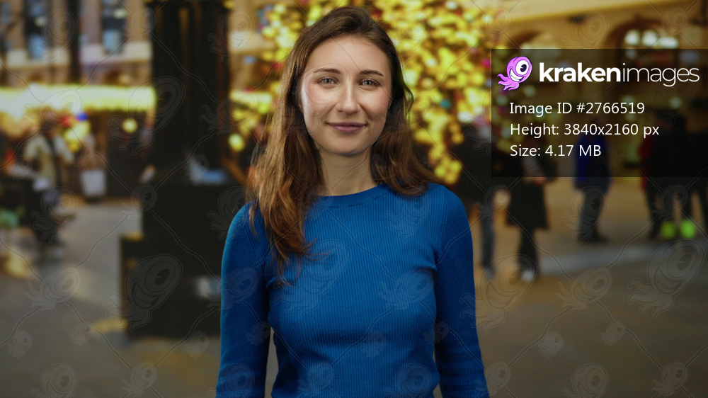 Woman smiling on city street during holiday night with bright lights and festive ambiance, young woman in blue sweater enjoying vibrant urban atmosphere outdoors. - Kraken Images