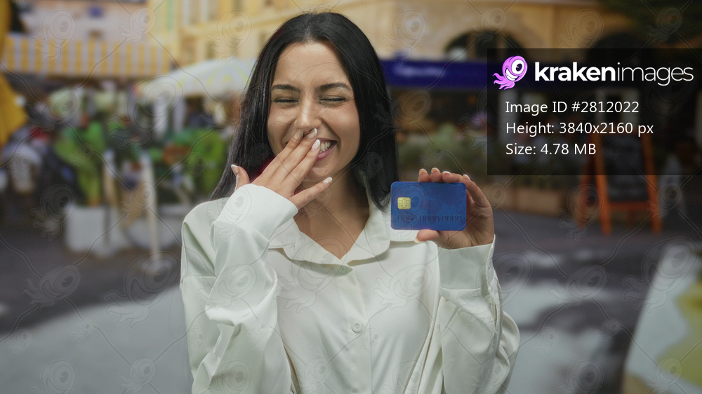 Woman smiling on city street holding credit card wearing white shirt, showcasing positive expressions and modern urban lifestyle.