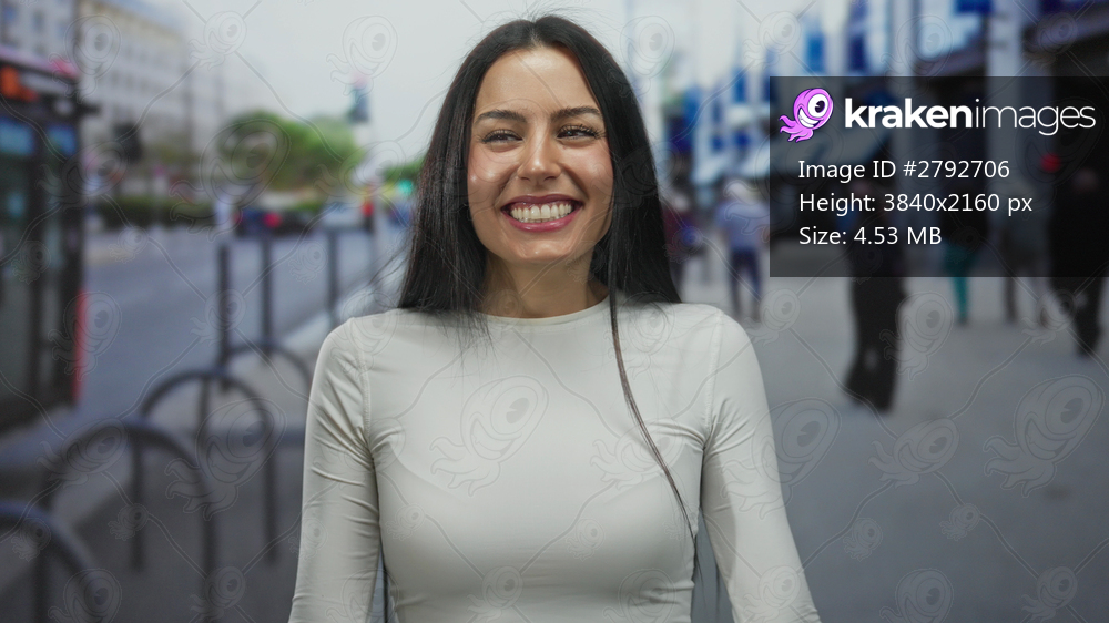 Woman smiling on city street with joyful expression showcasing vibrant urban scene and dynamic energy of outdoor lifestyle