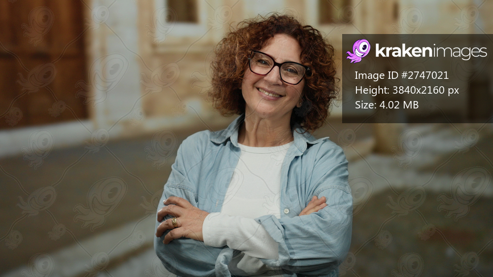 Woman smiling on city street outdoors wearing glasses and casual clothing with arms crossed and relaxed happy expression.