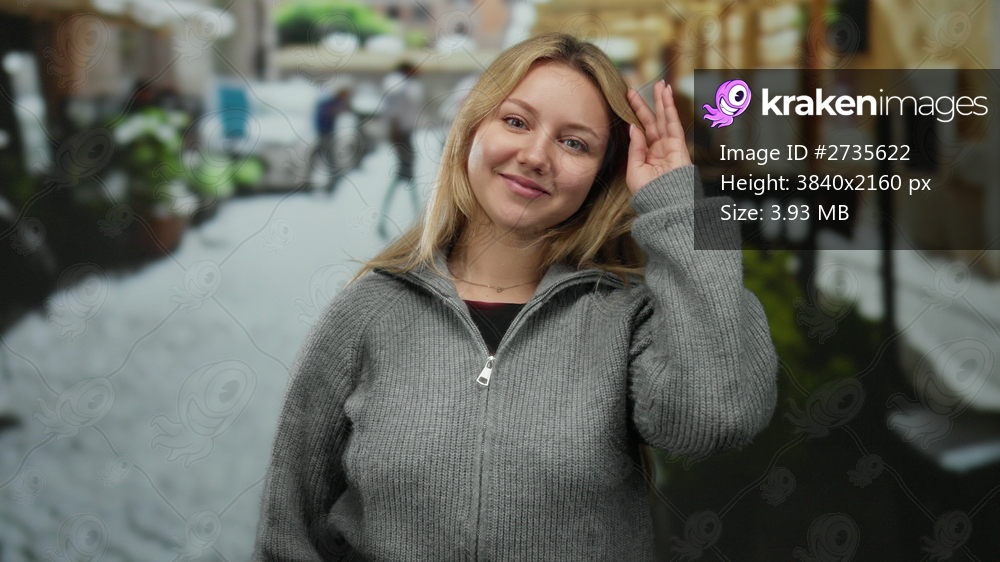 Woman smiling on city street, wearing gray, casual, clothing outdoors in urban, day setting with blonde hair and relaxed expression, capturing candid moment. - Kraken Images