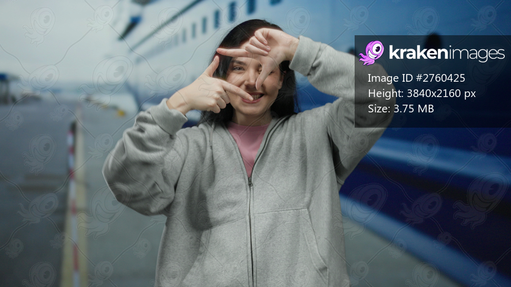 Woman smiling on cruise ship creating a frame with hands in a casual grey sweatshirt with a joyful expression highlighting travel and vacation vibes against a blue ocean backdrop. - Kraken Images