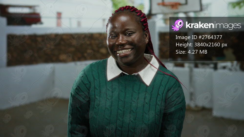 Woman smiling on outdoor basketball court with hoop and fences in the background, wearing a green sweater, showcasing a friendly expression and vivid hair. - Kraken Images