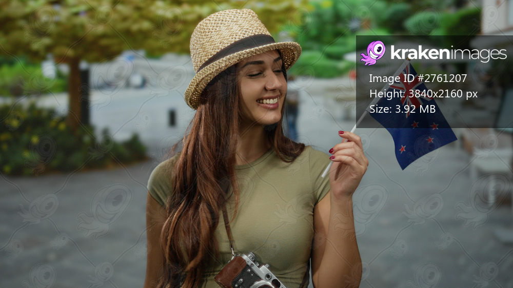 Woman smiling on outdoor restaurant terrace holding new zealand flag with camera and wearing hat providing a joyful travel moment in a vibrant outdoor setting. - Kraken Images
