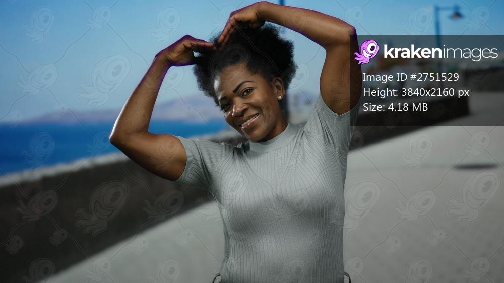 Woman smiling on promenade by the sea makes heart gesture under sunny blue sky.