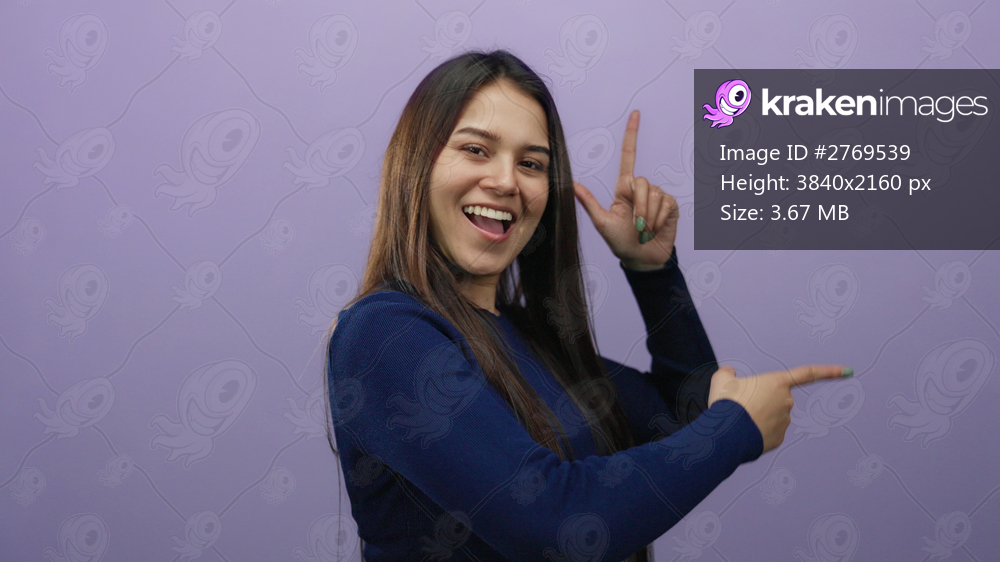 Woman smiling on purple background pointing upwards wearing blue sweater young adult happy hispanic isolated making sign cheerful gesture confident joyful positive girl.