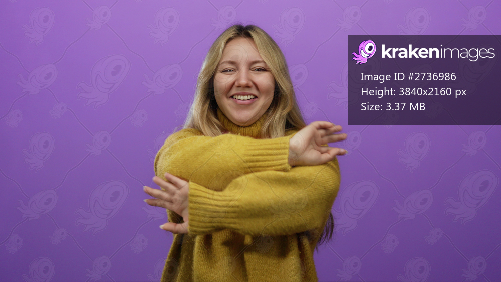 Woman smiling on purple background wearing yellow sweater laughing joyfully with hands raised against isolated wall illustrating happiness and carefree moments.