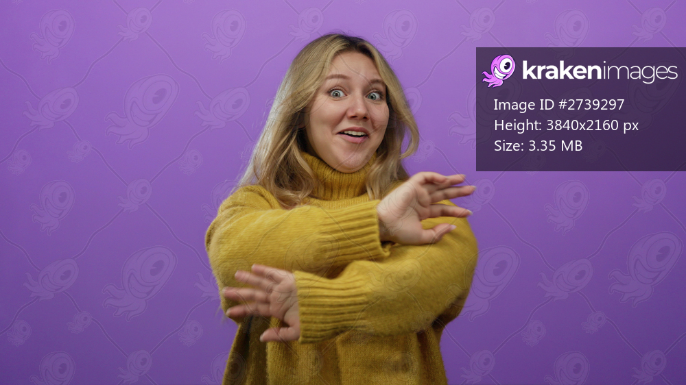 Woman smiling on purple background wearing yellow sweater laughing joyfully with hands raised against isolated wall illustrating happiness and carefree moments.