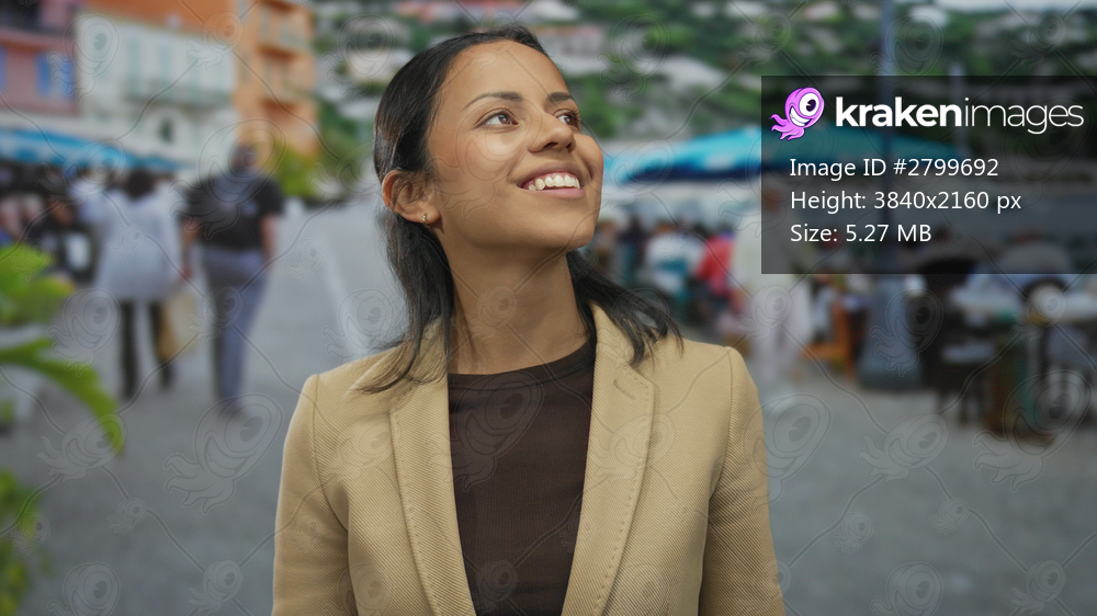 Woman smiling on street terrace wearing blazer with outdoor restaurant ambiance vibrant background of people and parasols suggesting lively urban life day environment. - Kraken Images