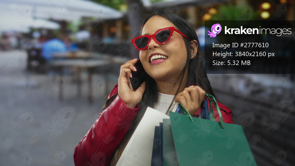 Woman smiling on street wearing sunglasses holding shopping bags talking on phone outdoors in city environment enjoying day with friends during shopping adventure - Kraken Images