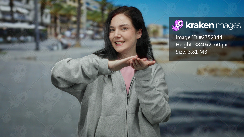 Woman smiling on sunny beach promenade in casual attire makes playful money gesture surrounded by palm trees and sea breeze, capturing carefree vacation vibes. - Kraken Images