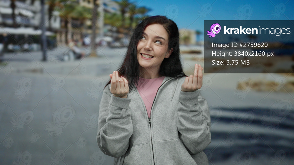 Woman smiling on sunny beach promenade in casual attire makes playful money gesture surrounded by palm trees and sea breeze, capturing carefree vacation vibes. - Kraken Images