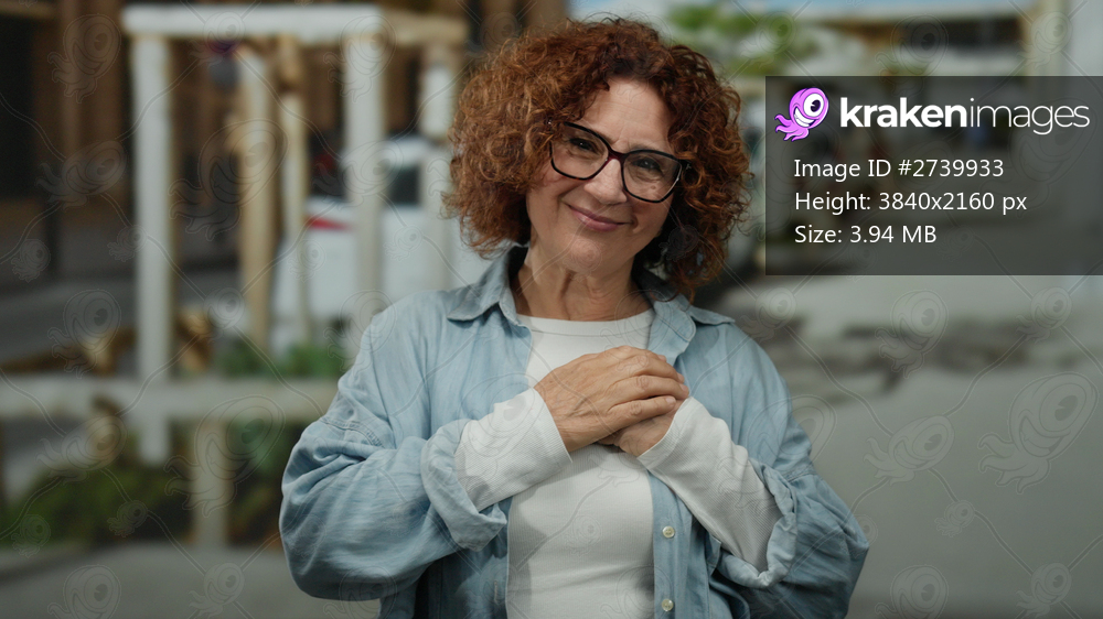 Woman smiling on urban street, curly hair and glasses, showing playful gestures outdoors under bright daylight.
