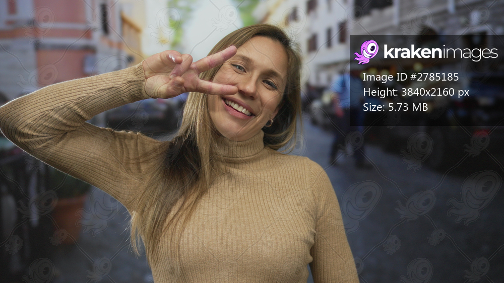 Woman smiling on urban street showing peace sign with blonde hair and beige sweater, conveying happiness and joy in bustling city atmosphere.