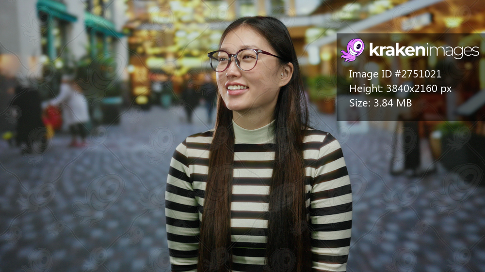 Woman smiling on urban street wearing glasses amidst blurred urban backdrop with vibrant lights capturing evening city atmosphere and lively pedestrian activity - Kraken Images