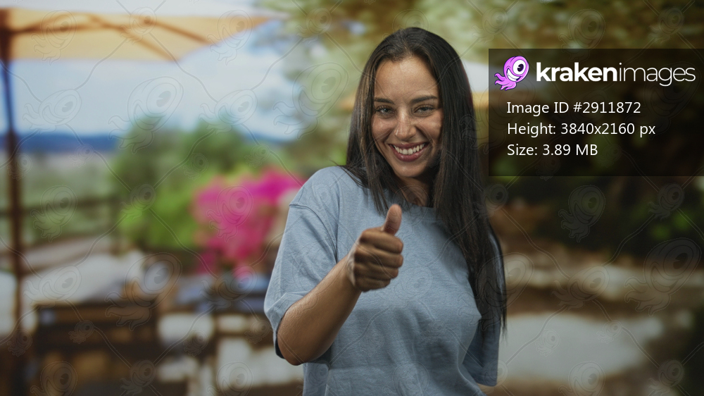 Woman smiling with open hands presenting on restaurant terrace with umbrella and flowers, wearing blue tshirt and casual pose; joy relaxed welcome.