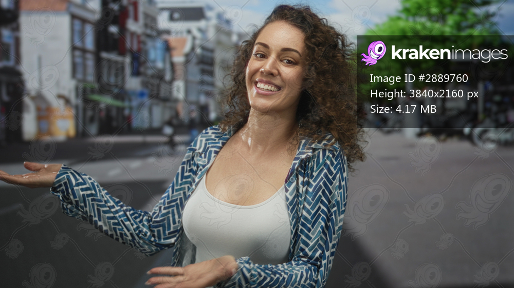 Woman smiling with open palms and bare chest visible on a city street in daylight, wearing white tank top and patterned shirt; friendly warmth joy.