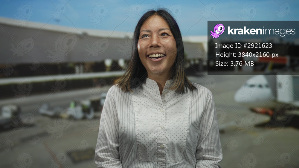 Woman smiling with open palms gesture at airport terminal tarmac near airplane outdoors; calm contentment.