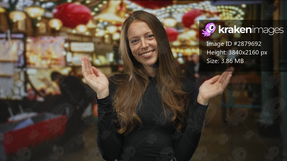 Woman smiling with open palms, hands raised toward camera amid souvenir stalls and decorative lights in a busy street market; holiday joy.