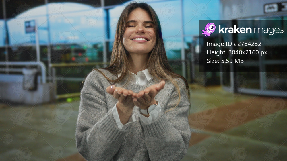 Woman smiling with open palms in outdoor airport setting, wearing a gray sweater against a modern terminal backdrop