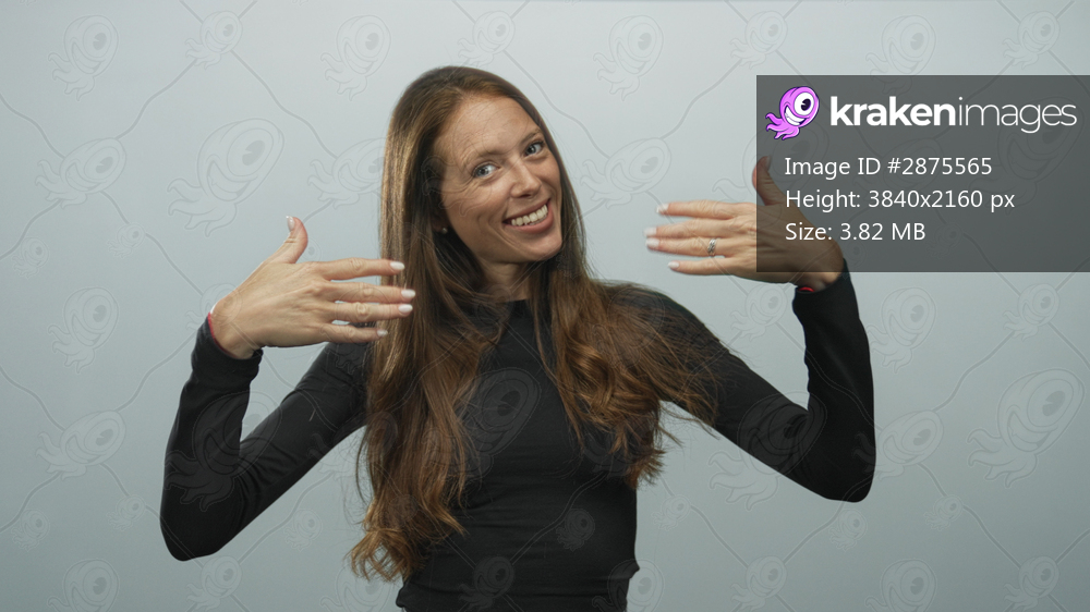 Woman smiling with open palms inviting gesture in studio with pale gray backdrop and long brown hair visible; warm invitation joy.