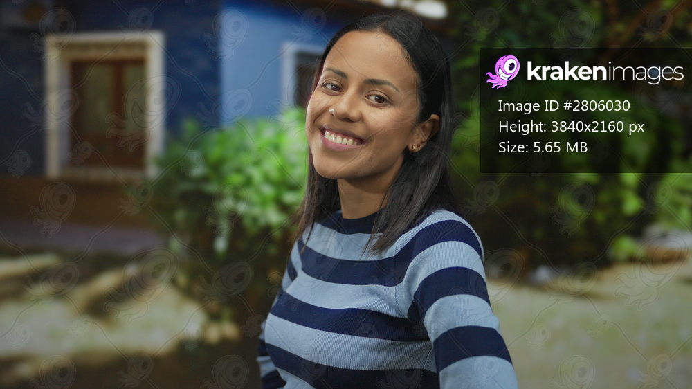 Woman smiling outdoors against a colorful urban background with lush greenery, showcasing a serene, cheerful atmosphere on a sunny day.