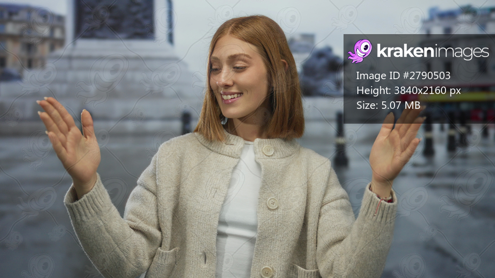 Woman smiling outdoors with arms raised, standing on a wet urban street, with buildings and traffic in the background, exhibiting a cheerful and relaxed demeanor. - Kraken Images