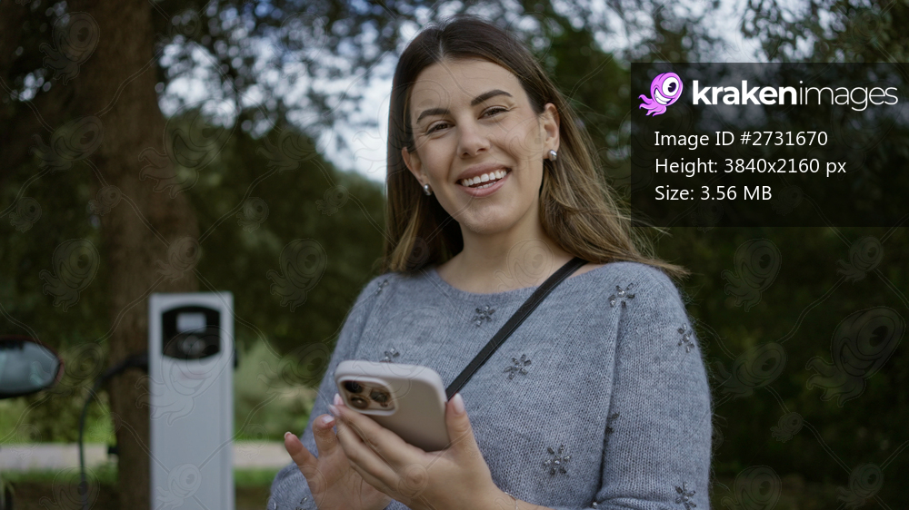 Woman smiling outdoors at charging station while using phone with electric car in background, showcasing modern technology and energy.