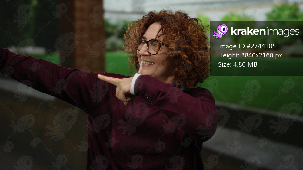Woman smiling outdoors at park pointing with confidence demonstrates enthusiasm in an outdoor environment showcasing confidence and excitement surrounded by greenery. - Kraken Images