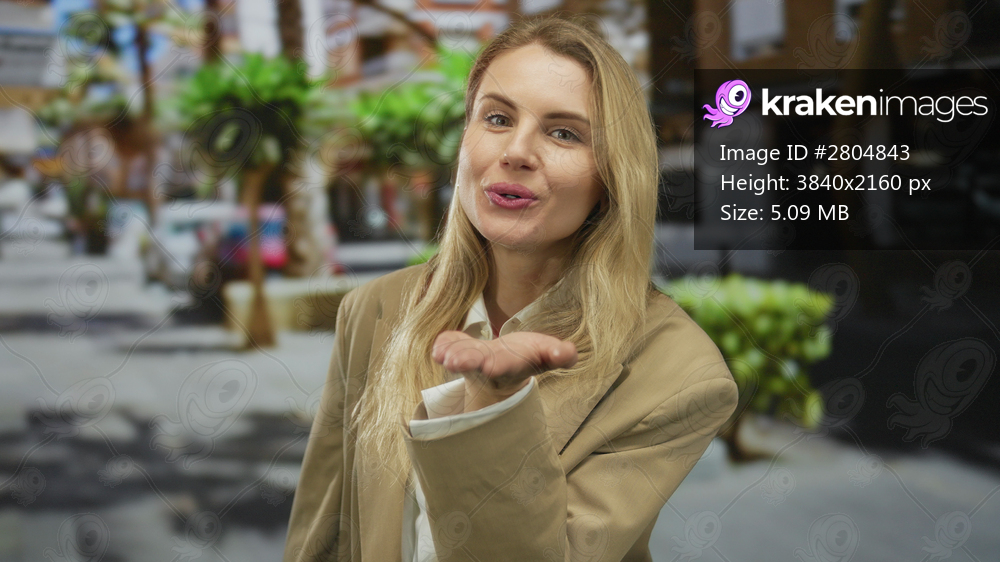 Woman smiling outdoors blonde city street urban lifestyle fashion blowing kiss cheerful friendly.