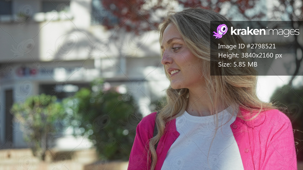 Woman smiling outdoors with blonde hair wearing a pink sweater in a sunny urban area with trees and buildings in the background.