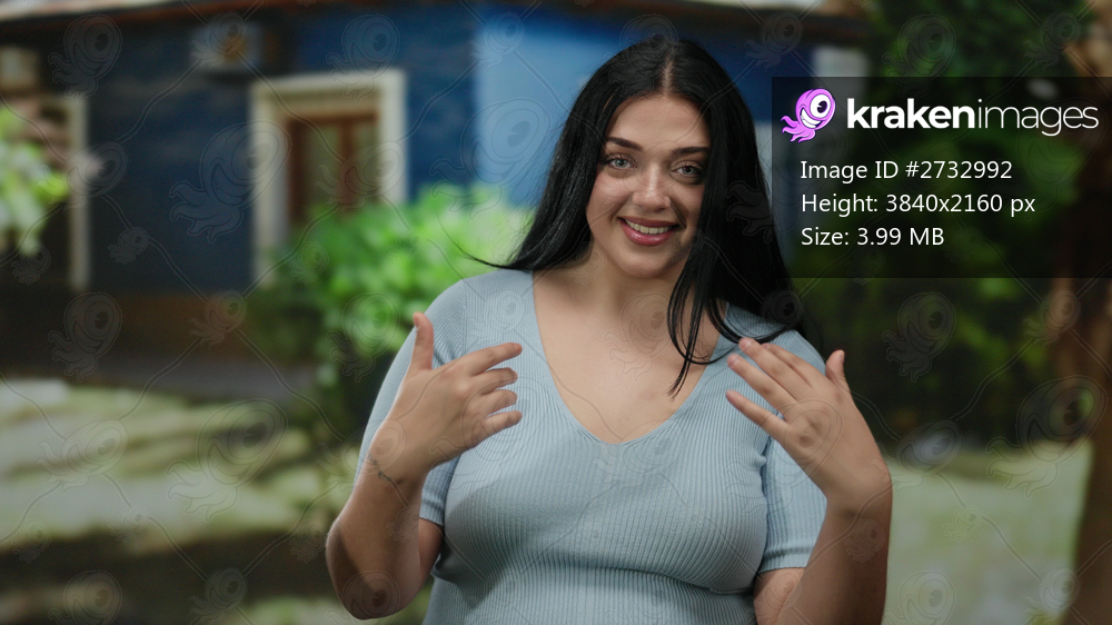 Woman smiling outdoors with blue house background gesturing invitingly in a vibrant park setting, capturing a cheerful and welcoming moment.